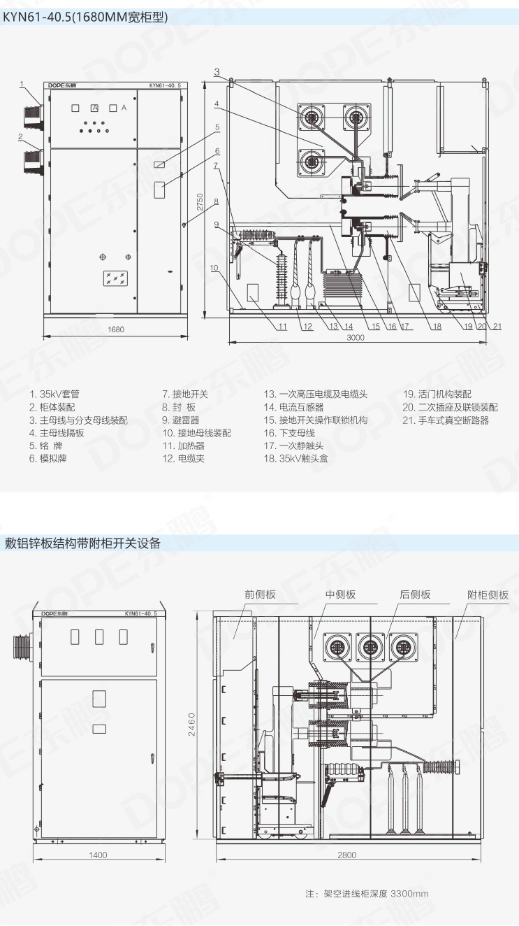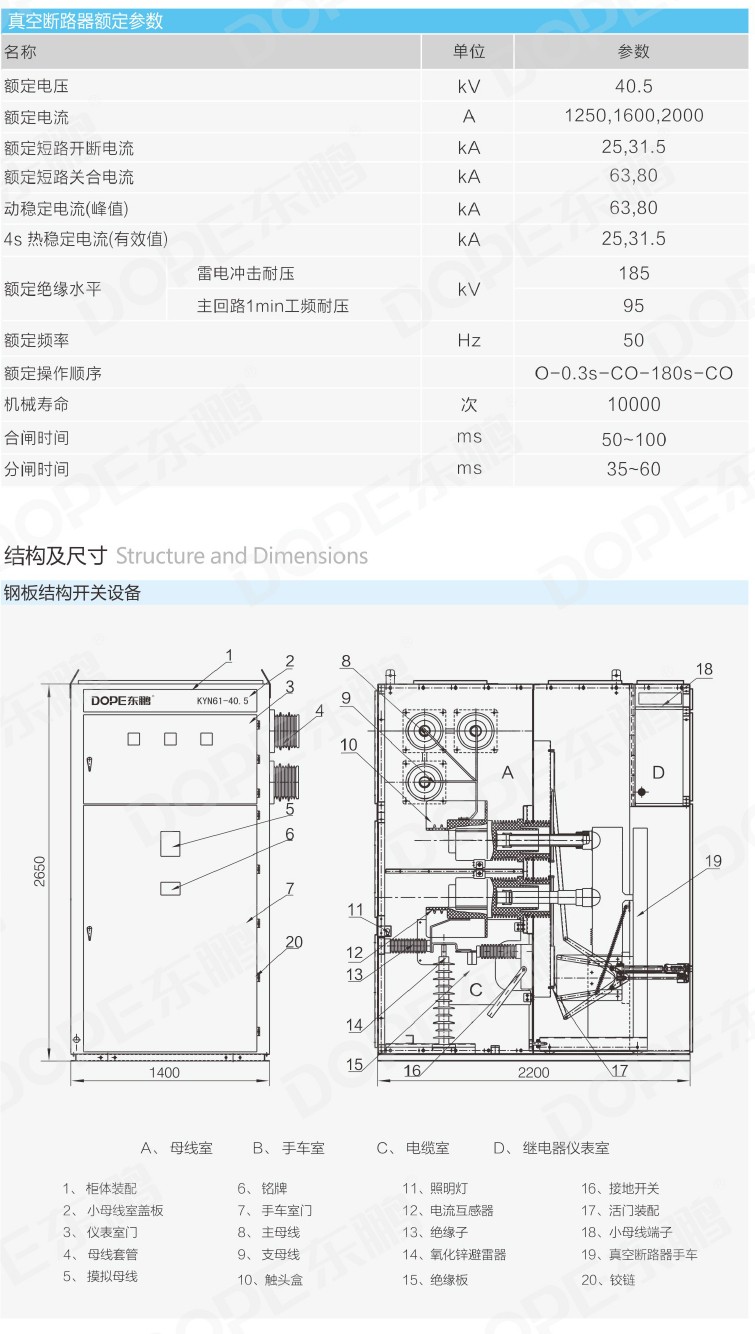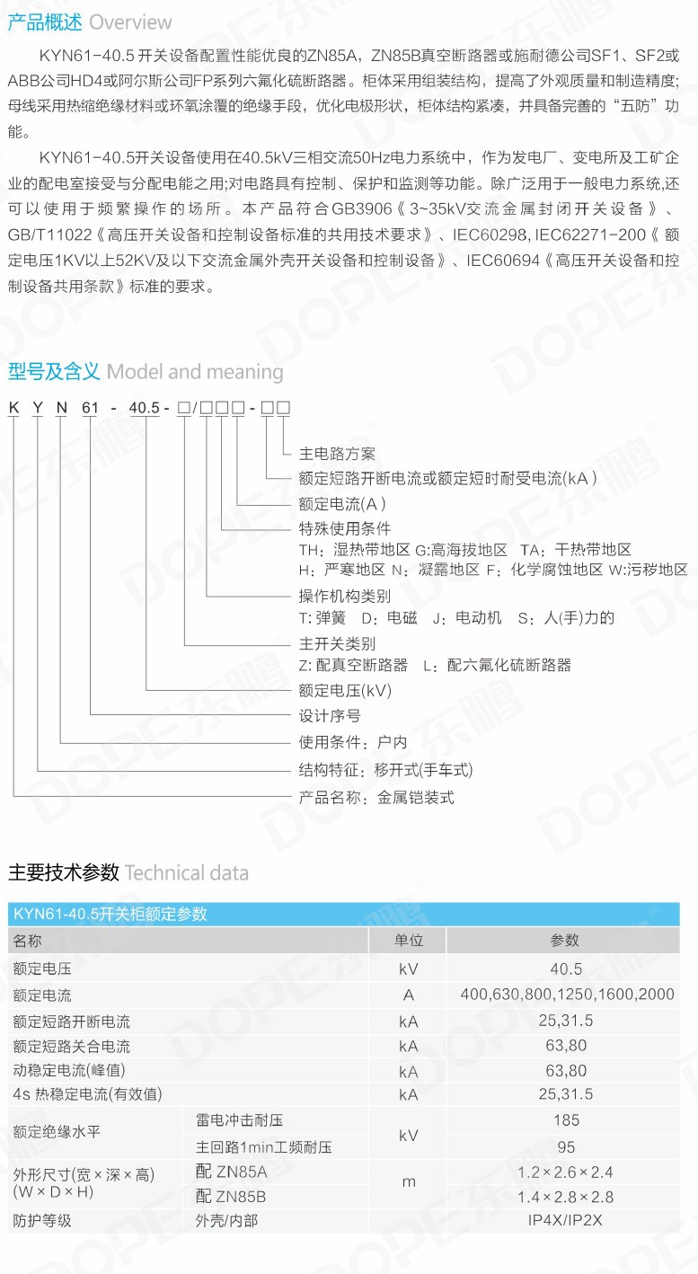 KYN61-40.5(Z)是指铠装移开式交流金属封闭开关柜(以下简称开关柜)系三相交流量50Hz、额定电压40.5kV的户内成套配电装置。作为发电厂、变电站及工矿企业接受和分配电能之用,对电路起到控制、保护和检测等功能,还可用于频繁操作的场所。