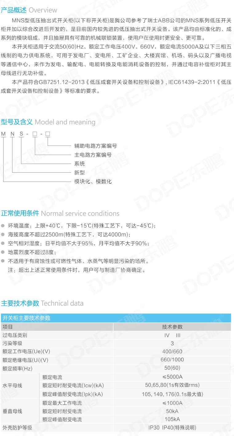 MNS低压抽出式开关柜适用于交流50Hz,额定工作电压660V及以下的系统。作为各种发电、输电、配电、电能转换和电能消耗设备的控制设备,能广泛应用于各工矿企业、大楼宾馆、市政建设等低压配电系统中。除一般陆用外,经过特殊处理后,还可以用于海上石油钻采平台和核电站中。